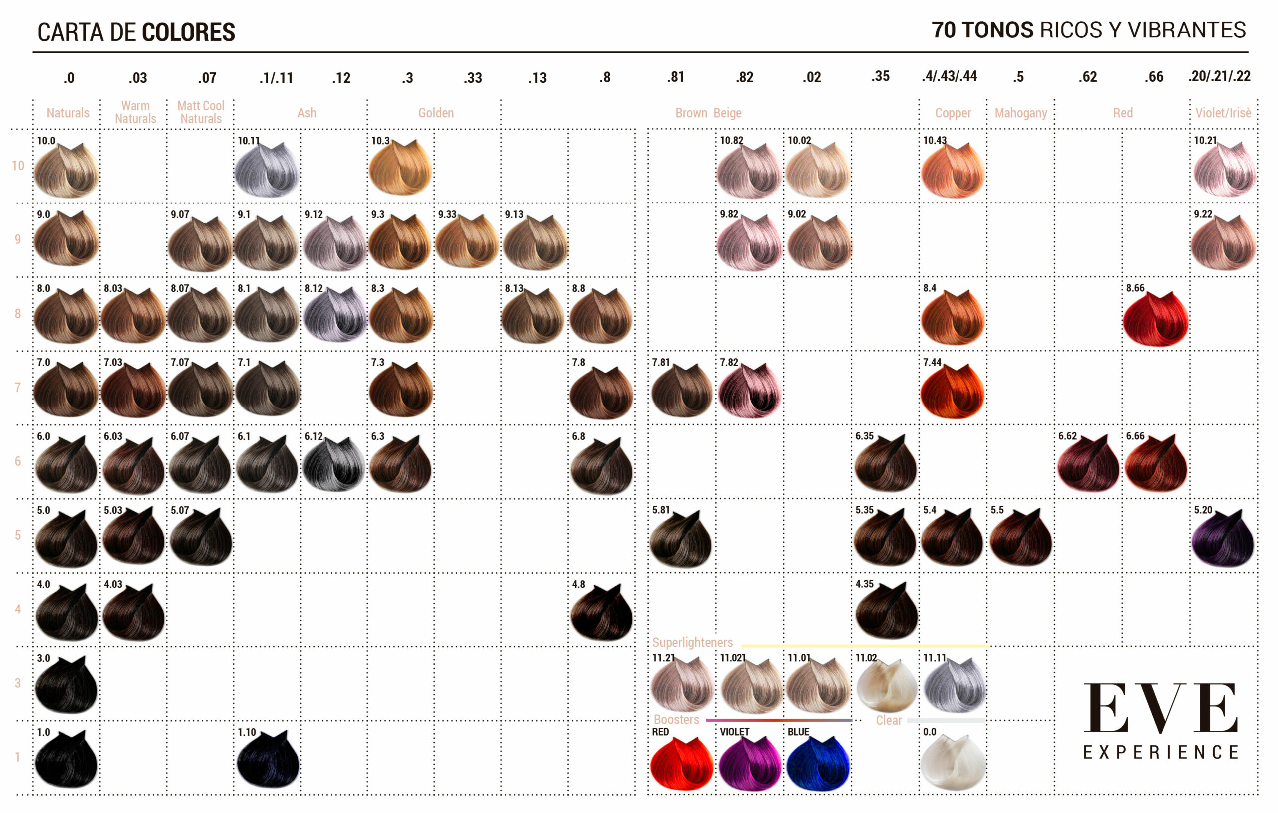 La carta de color Eve Contiene todos los colores de los tintes Eve Experience. El primer tinte permanente de nueva generación con infinite color+ y tecnologia KV, creada armonizando la ciencia y la naturaleza.