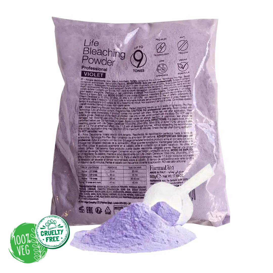 – Vegano y libre de crueldad animal: La Decoloración Violet es 100% vegana y Cruelty Free (Libre de crueldad animal) . Su composición y diseño se ha creado respetando a los animales, por lo que no contiene ningún producto de derivación animal ni ha sido testado en animales.