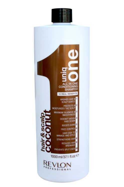 Revlon uniq one 10 en 1 coconut hair&scalp champú. Limpia e hidrata tu cabello y cuero cabelludo proporcionando 10 beneficios reales y consiguiendo un cabello suave, brillante y con cuerpo. Déjate seducir por su irresistible aroma a coco.